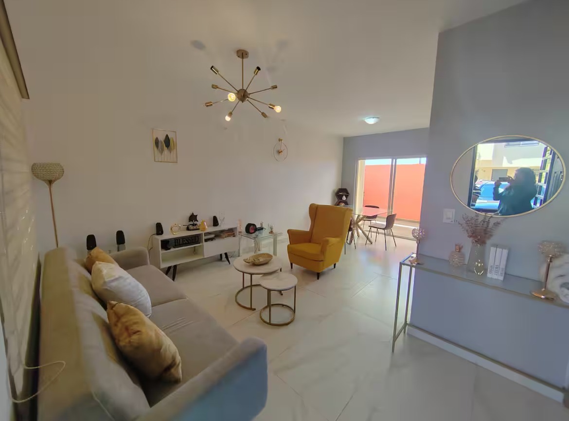 PLANTA BAJA: AREA DE RECIBIDOR CON MESA DE CRISTAL AL INGRESAR Y ESPEJO, MEDIO BAÑO CON ESPEJO CON LUZ LED, ESPACIO SALA COMEDOR AMUEBLADAS TODO ACORDE A LA DECORACION DE LA CASA, COCINA INTEGRAL BLANCA CON BASTANTE ILUMUNACION, PATIO, CON LAVADORA Y SECADORA, MESITA EN EL PATIO Y SALIDA DE PATIO A COCHERA POR LADO LATERAL DE LA CASA, COCHERA PARA 2 AUTOS.